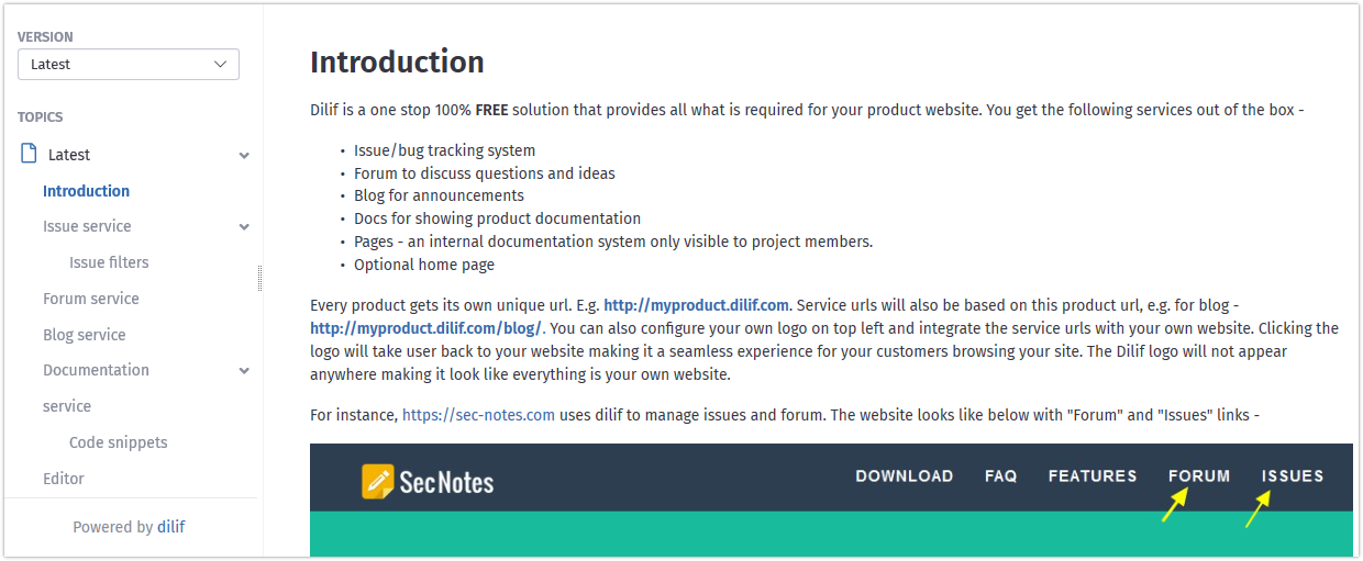 Register Project IntroductionDilif provides 5 cloud services - Bugs, Blog, Forum, Documentation and pages(team internal collaboration documents). Each service can be integrated into your website easily. Customize the services so they look like coming from your own website giving a seamless experience to your customers. Perfect for teams with multiple developers.